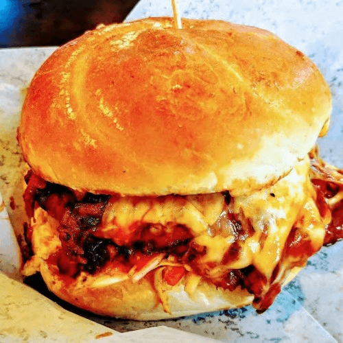 Mayo, BBQ sauce, Coleslaw, Horseradish, Choice of cheese, Served on a Brioche bun (Classic)