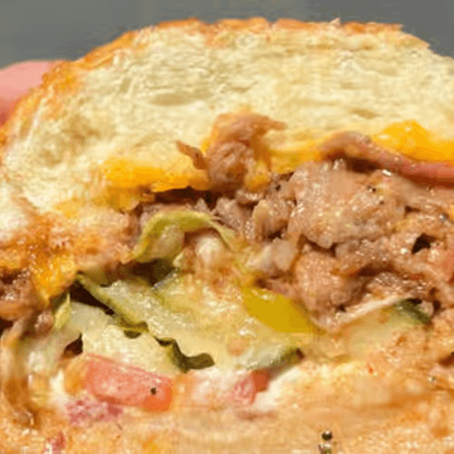 1/2 lb. beef patty with both Swiss and Muenster cheese, mayo, and NY mustard with thousand island dressing and lettuce, tomato, pickles, pepperoncini's, and caramelized onions served on grilled sourdough bread