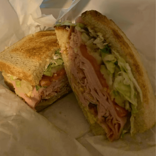 Triple decker of toasted sliced wheat, Ham, Turkey, Bacon, Cheddar cheese