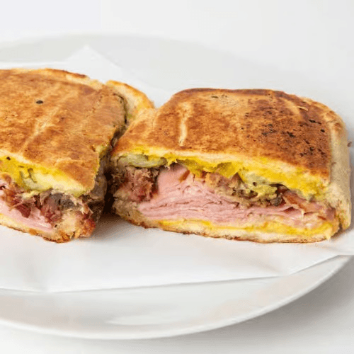 Roasted pork, Caramelized onions, Pepperoncini's, Ham, Swiss cheese, Yellow mustard, Kosher pickle, Cajun garlic aioli, served on White roll.Please note that the sandwich will not be grilled or pressed if ordering anything other than "Classic."