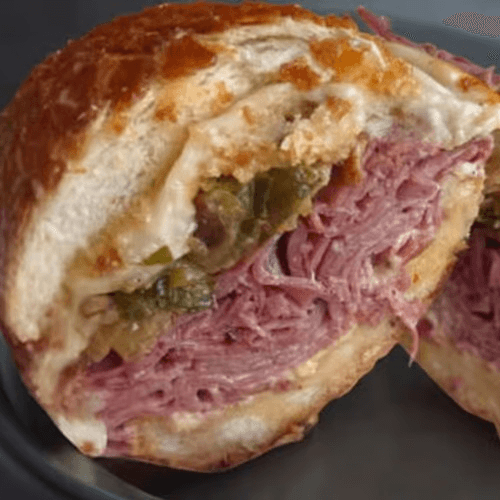 Fried poppers, Cream cheese, Roast beef, Muenster cheese, cheddar cheese, served on Grilled sourdough