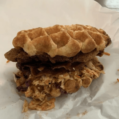Two Belgian waffles, Fried chicken, bacon jam, Bacon, Roscoe sauce,