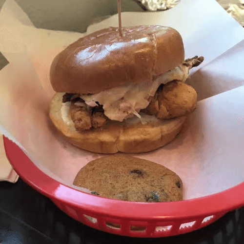 Fried chicken, Pesto slaw, Pesto, Fast Eddie's sauce, Mayo, Tomato, served on Sweet bun
