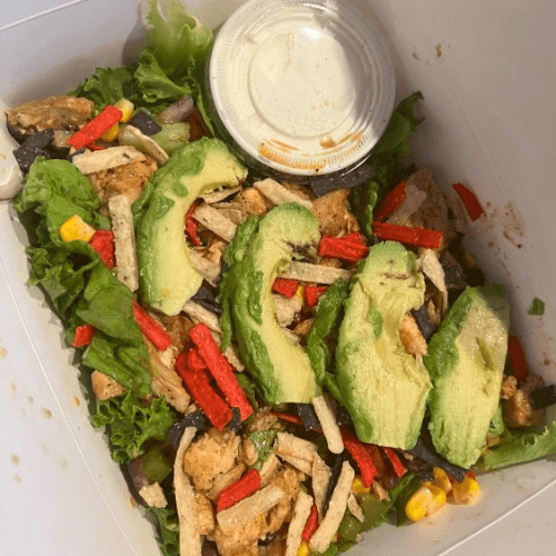 Grilled chicken breast on top of green leaf lettuce with southwest salsa, red onions, tomatoes, avocado and tortilla strips. Served with Ranch on the side